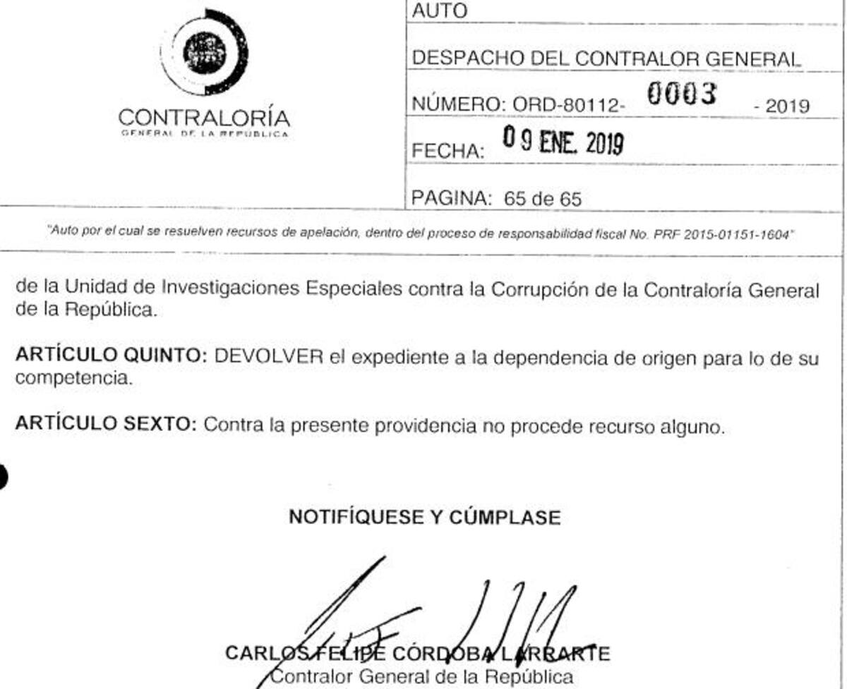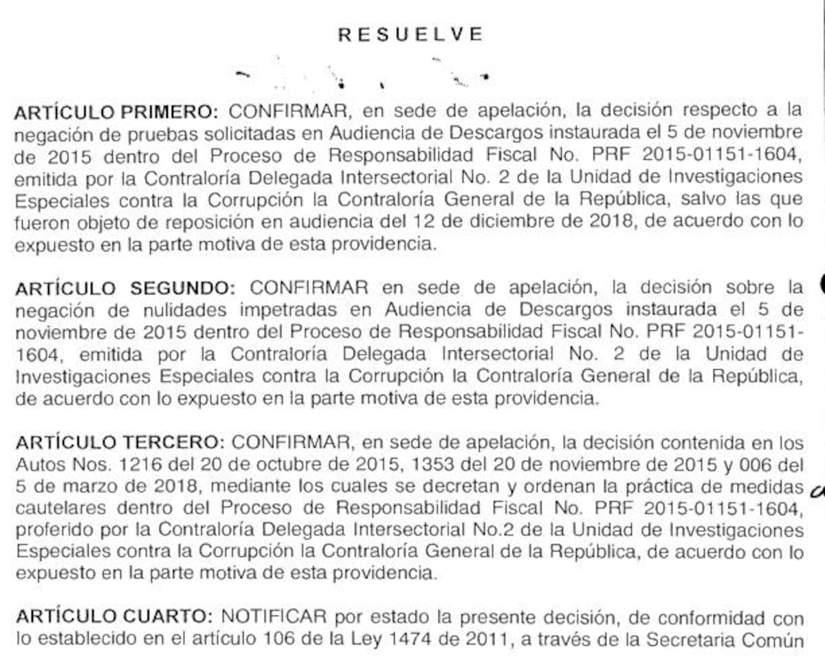 El ente regulador a través de un documento, expedido el pasado 9 de enero de 2019, rechazó la apelación de las medidas cautelares contra funcionarios implicados en este cartel, en el que también se encuentra el exgobernador de Bolívar Juan Carlos Gossaín.