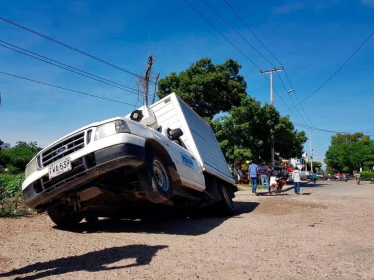 Tremendo susto se llevaron el conductor y un pasajero de un camión de placas TVA 539 que por poco cae al canal Ricaurte en la mañana de este miércoles.