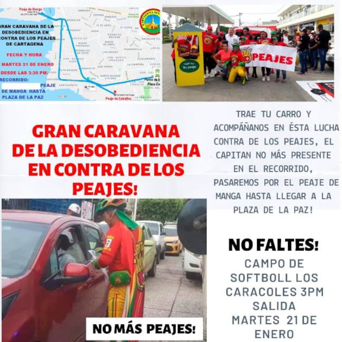 La protesta, denominada “Gran Caravana de la Desobediencia en Contra de los Peajes” es convocada por organizaciones como “Cartagena Sin Peajes”, “Vejuca”, “Movimiento Cartagena Heroico”, entre otras.