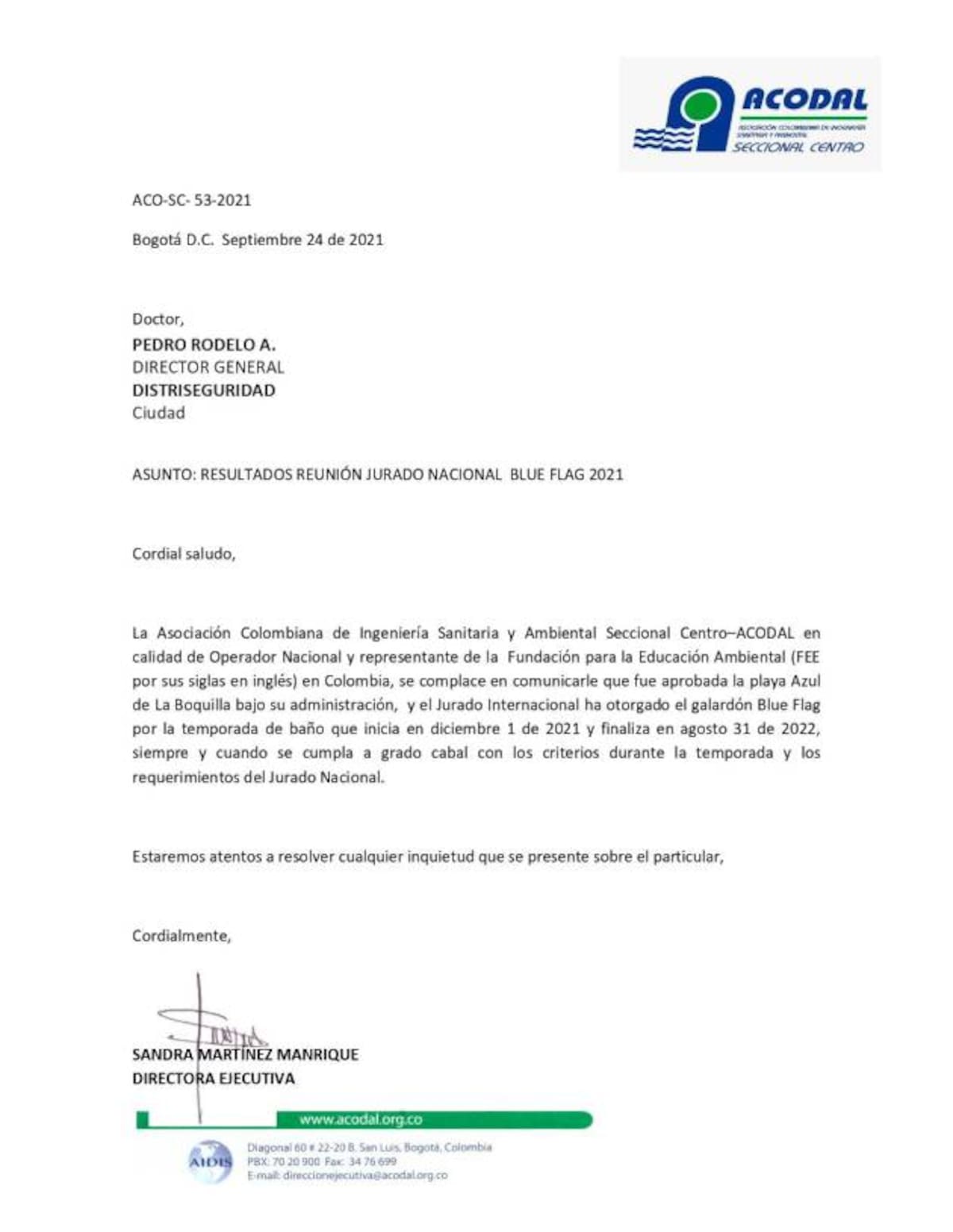 La Asociación Colombiana de Ingeniería Sanitaria y Ambiental (Acodal), operador nacional del programa Bandera Azul, manifestó que el galardón ‘Blue Fag’ tiene vigencia para la temporada del 1 de diciembre de 2021 hasta el 31 de agosto de 2022.