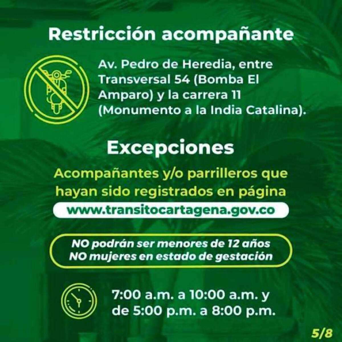 Por esta vía solo podrán circular acompañantes y/o parrilleros que estén registrados en la página www.transitocartagena.gov.co entre las 7:00 a.m a 10 a.m y 5:00 p.m a 8:00 p.m. No podrán ser mejores de 12 años ni mujeres en estado de gestación. (También le puede interesar: ¡Atención! Decreto con nuevas restricciones para motociclistas en Cartagena)