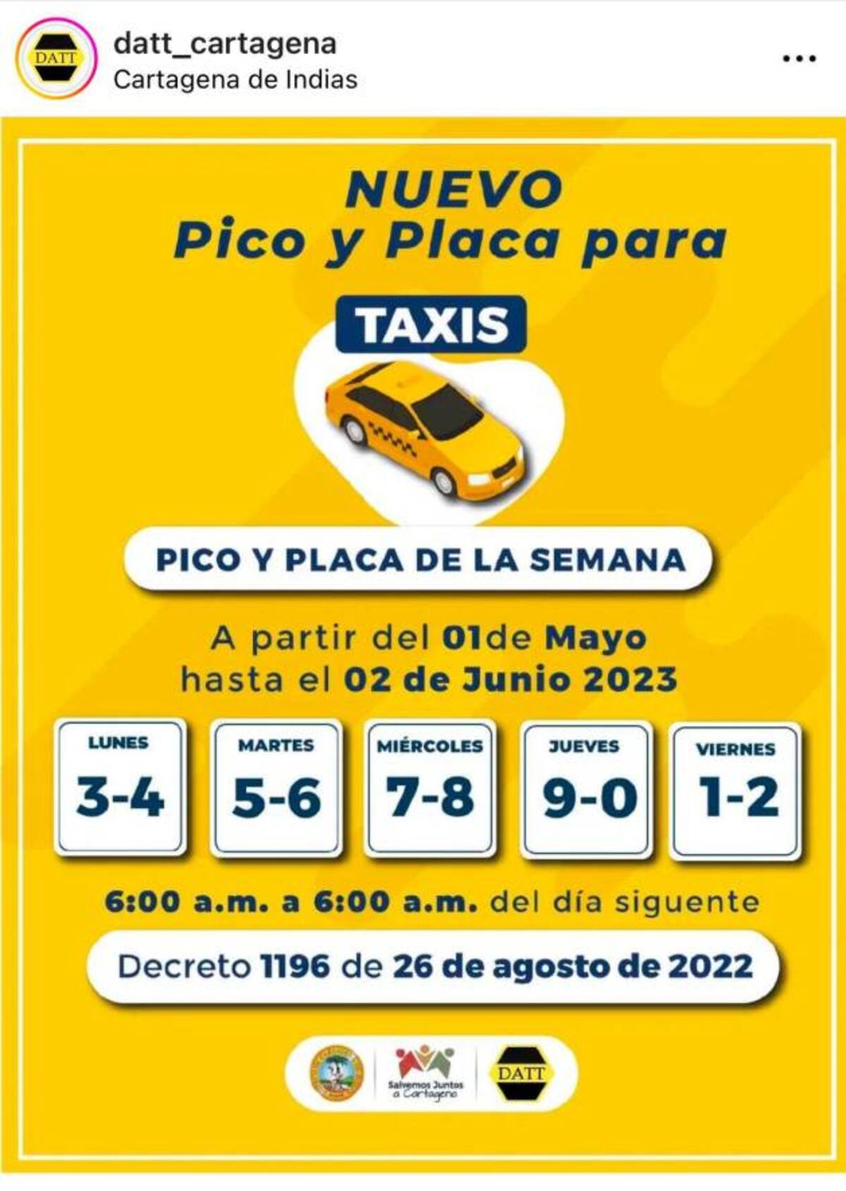 La medida aplica en cumplimiento de los decretos distritales que regulan la movilidad en la ciudad: 0304 del 24 de febrero de 2023, para vehículos particulares; 0306 del 24 de abril de 2023, para motocicletas; y el 1196 del 26 de agosto de 2022, para taxis. Lea también: Video: ¡Qué susto! Vehículo quedó atrapado en arroyo de San Pedro