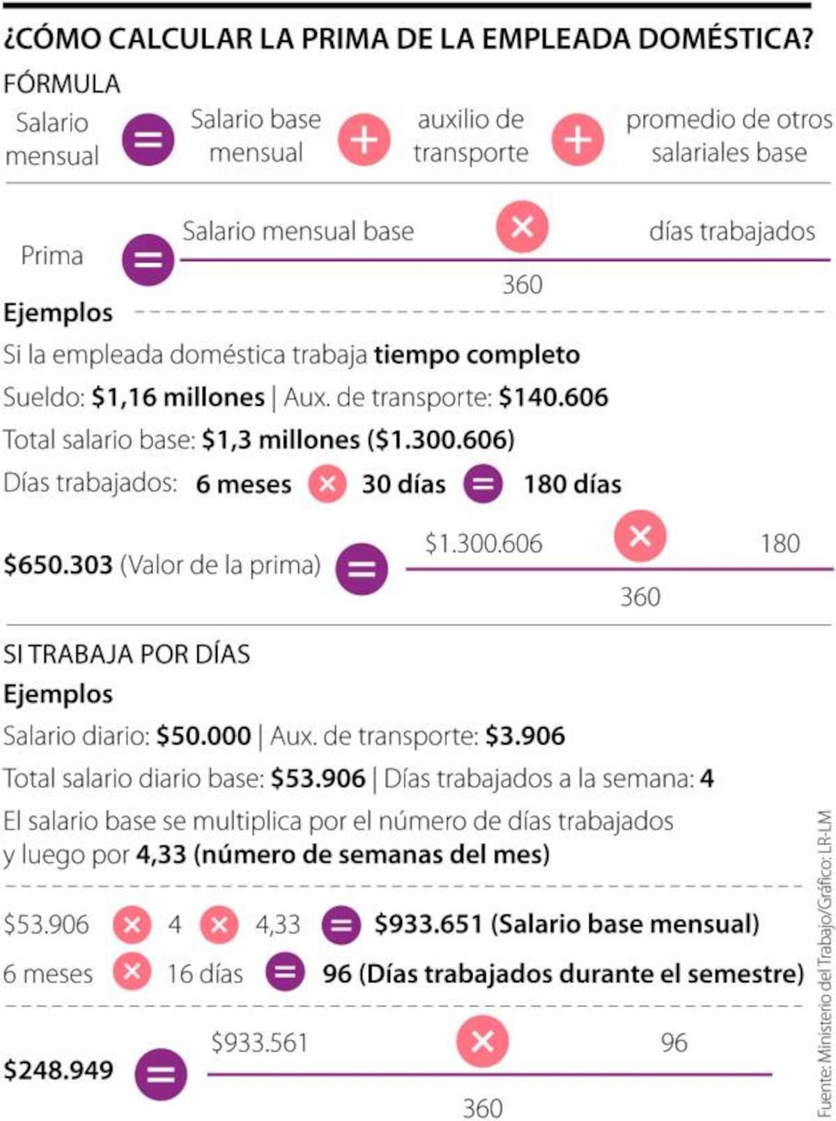 Por ejemplo, si usted tiene una empleada doméstica con una jornada de tiempo completo que trabaja desde agosto y recibe el salario mínimo, su sueldo base sería de $1,16 millones, más el auxilio de transporte de $140.606, es decir, $1,3 millones. Para sacar la prima, debe multiplicar ese salario base mensual ($1,3 millones) por los días trabajados durante el semestre (4 meses X 30 días = 120 días) y se divide entre 360, con lo que la prima sería de $433.535. Lea también: ¡Tienen casa propia! 2.678 títulos de propiedad entregados por Corvivienda
