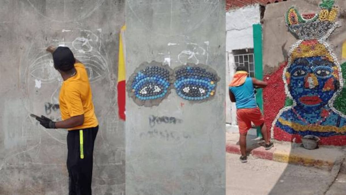 Son cerca de 15 metros cuadrados aprovechados por este mural de tapitas recicladas, donde los dibujos de una palenquera y una mariamulata son protagonistas. Le puede interesar: El imponente mural acuático que hicieron en Los Calamares