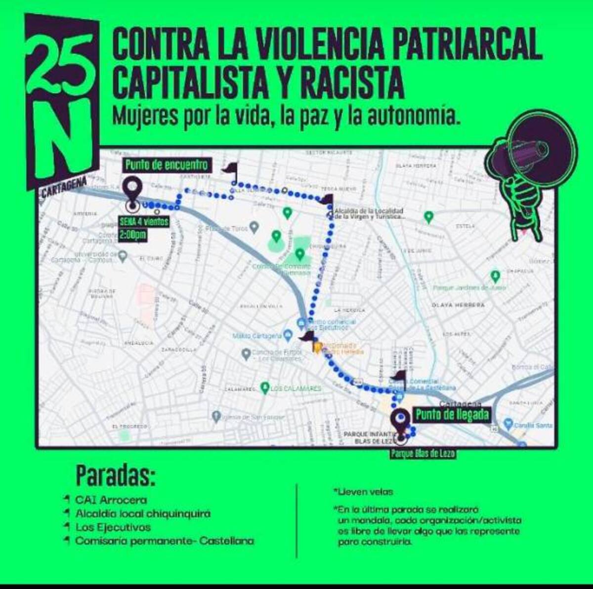 Este 25 de noviembre las mujeres en Cartagena y Bolívar conmemoramos el Día Internacional de la Eliminación de las Violencias Contra las Mujeres, bajo la consigna “Contra la violencia patriarcal, racista y capitalista. Mujeres por la vida, la paz y la autonomía”. A partir de una gran movilización social, las mujeres se toman las calles exigiendo espacios labores, escuelas, universidades, espacios públicos y hogares libres de violencia. Las mujeres siguen siendo las principales víctimas de delitos sexuales cometidos por familiares, parejas, ex parejas y conocidos. Además, enfrentan violencias en las empresas, las cuales actúan con total impunidad enfermando los cuerpos de las mujeres para aumentar su productividad. Las mujeres denunciamos, además, que hay madres en los barrios populares que están luchando contra las violencias policiales racistas, sin que cuenten con las suficientes medidas de protección. De igual forma, marchamos por las lideresas en barrios de Cartagena y municipios de Bolívar, que enfrentan la presencia de grupos armados ilegales y el recrudecimiento de las violencia.