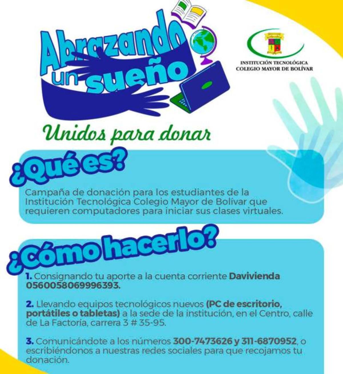 La Institución Tecnológica Colegio Mayor de Bolívar se prepara para iniciar las clases virtuales, a partir del 23 de abril. Sin embargo, en una caracterización hecha, se evidenció que muchos de nuestros estudiantes no tienen equipos tecnológicos y algunos no cuentan con conexión a internet para arrancar con este proceso.