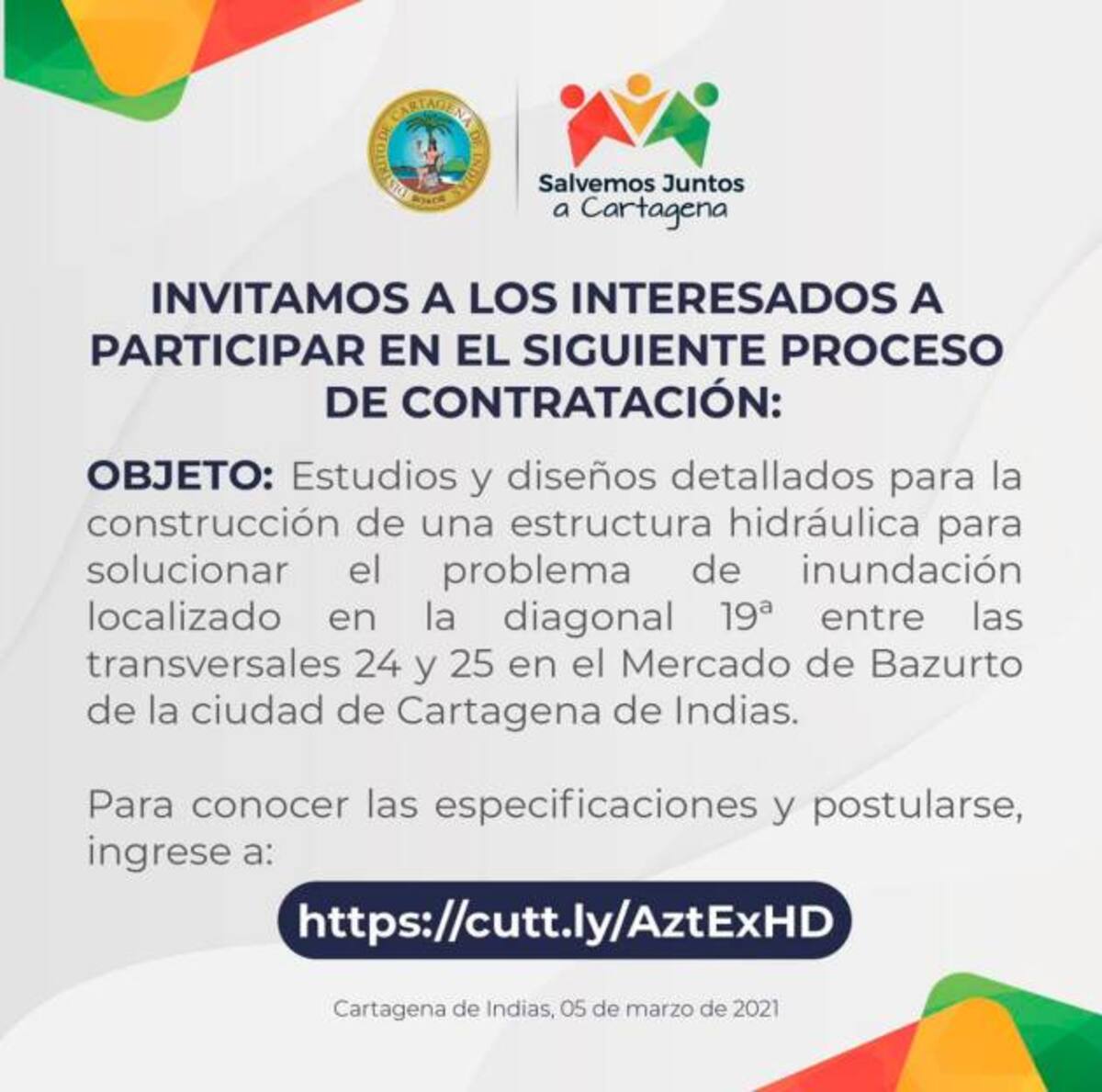 La Secretaría de Infraestructura abrió la licitación para contratar “consultoría, estudios y diseños detallados para la construcción de una estructura hidráulica que permita solucionar el problema de inundación en la Diagonal 19ª, entre las transversales 24 y 25, en el Mercado de Bazurto”.
