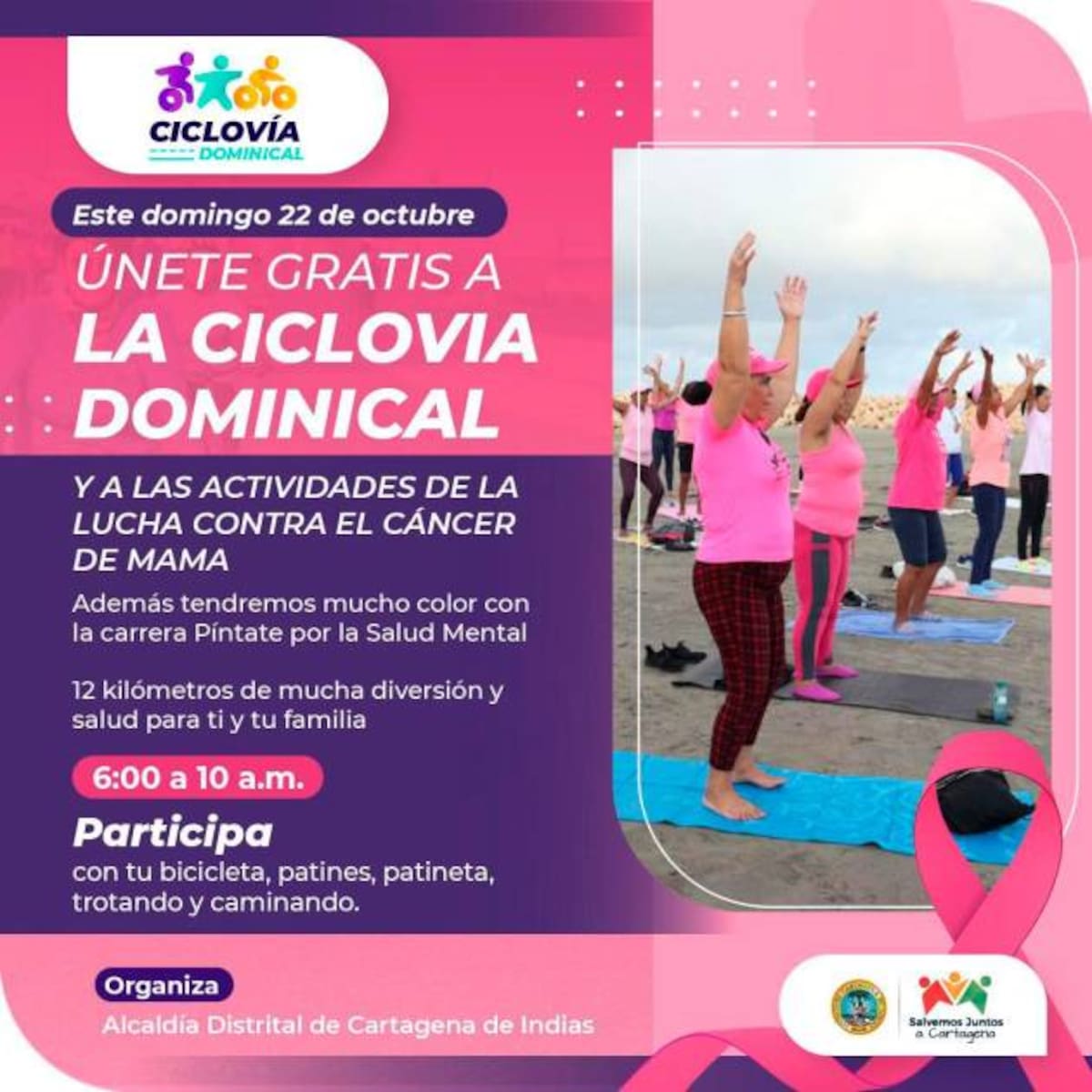 La Alcaldía de Cartagena extiende una cordial invitación a todos los cartageneros y visitantes para que se unan a este espacio recreativo y deportivo, en apoyo a la lucha contra el cáncer de mama y la promoción de la salud mental.