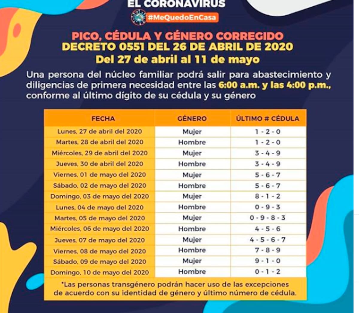 Para esto, pueden circular libremente en las calles entre las 6 de la mañana y las 4 de la tarde, iniciando mañana, lunes 27 de abril, las mujeres con cédulas terminadas en 1, 2 y 0; el martes, 28 de abril, le correspondería salir a los hombres con estos mismos dígitos y así sucesivamente.