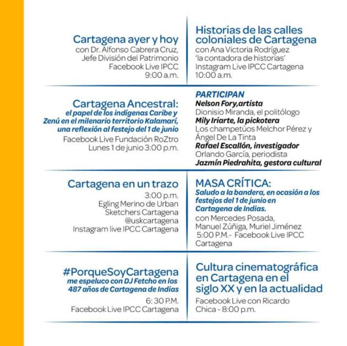 - A lo largo del día: El Instituto de Patrimonio y Cultura de Cartagena (IPCC) transmitirá a través de su Facebook Live ocho conferencias. Aquí la hora y el tema que se abordará en el encuentro.