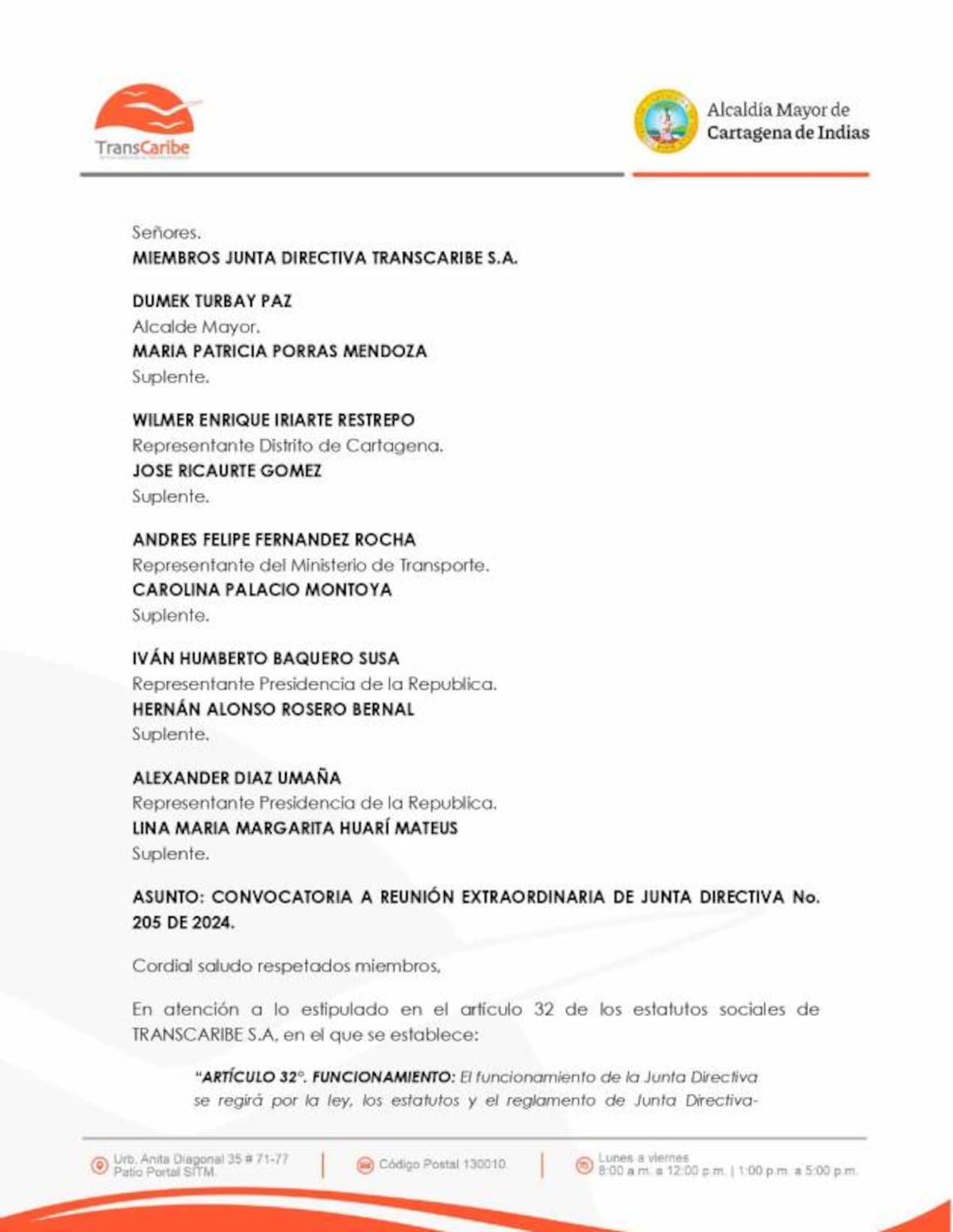 El Universal tuvo acceso al oficio que convoca a la reunión de la junta, integrada por el alcalde Dumek Turbay, María Patricia Porras, secretaria general; Wilmer Iriarte, secretario de Infraestructura; José Ricaurte, director del DATT; Andrés Hernández y Carolina Palacio, representantes del Ministerio de Transporte; e Iván Baquero, Alexander Díaz, Hernán Rosero (suplente) y Lina Huarí (suplente), representantes de la Presidencia de la República.