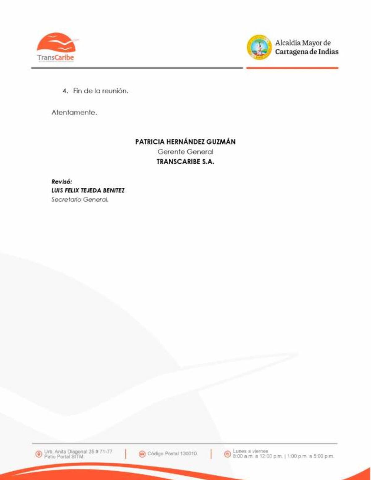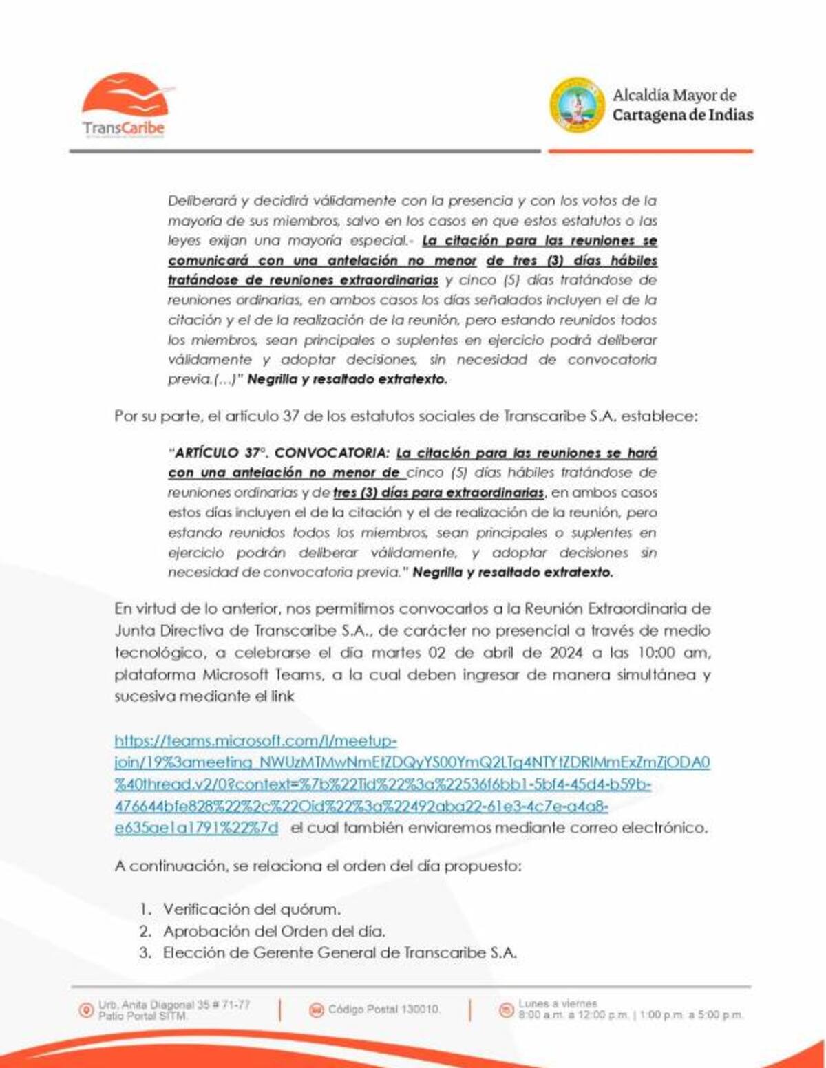 En ese documento, firmado por Patricia Hernández, se lee que uno de los puntos del orden del día es la elección de un nuevo gerente general para Transcaribe.