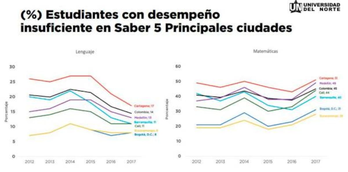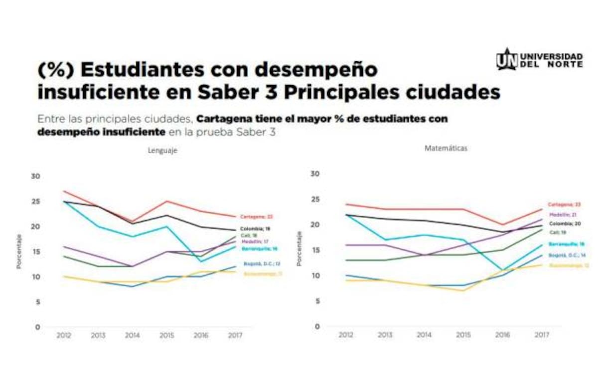 En el caso de las Pruebas Saber para grado 3° se evidenció que Cartagena tiene el mayor porcentaje de estudiantes con desempeño insuficiente en las áreas de lenguaje y matemáticas (22% y 23%, respectivamente), cuando el promedio nacional de estudiantes en el mismo nivel es del 19% para lenguaje y 20% para matemáticas.