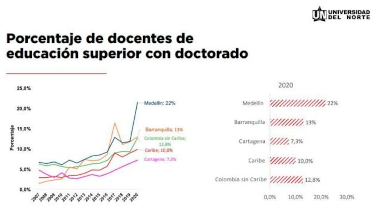 Así mismo, en cuanto a los docentes de educación superior solo el 7,3% cuenta con doctorado, una cifra nuevamente por debajo del promedio en el Caribe (10%) y a nivel nacional (12,8%).