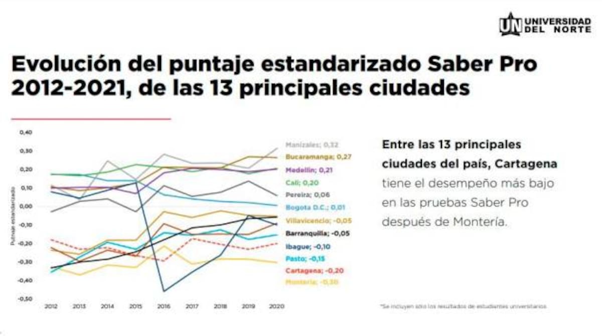 Por otra parte, en el nivel universitario, si bien el 59,6% de los estudiantes está matriculado en una institución acreditada, el desempeño en las Pruebas Saber Pro también es bajo. En comparación a las principales ciudades del país, Cartagena solo supera a Montería en puntaje.
