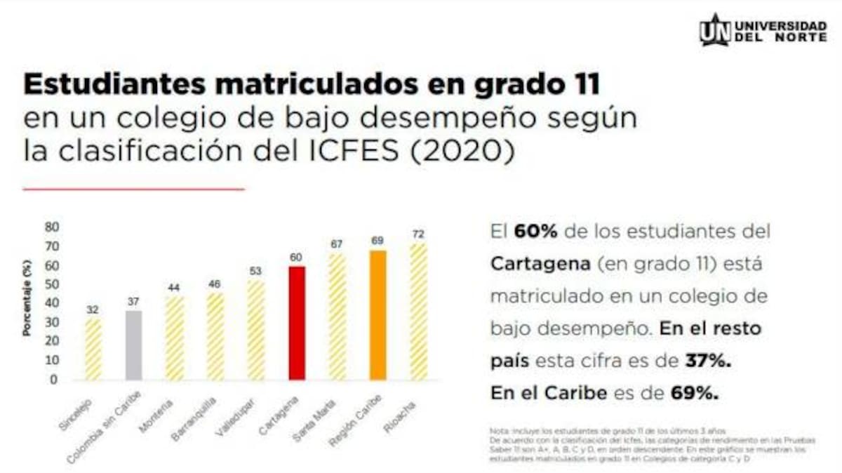 El estudio confirmó que el 60% de los estudiantes en la ciudad de grado 11° está matriculado en un colegio de bajo desempeño académico, una cifra muy por encima del promedio nacional, equivalente, al 37%.