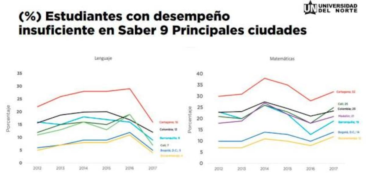 Y en confirmación de que en el bachillerato la situación no mejora, los resultados de las Pruebas Saber para grado 9° también posicionan a la ciudad como una de las de peor desempeño. Aquí, el porcentaje de estudiantes con desempeño insuficiente en lenguaje es del 16% (el promedio nacional es del 12%), y en matemáticas del 32% (el promedio nacional es del 23%).