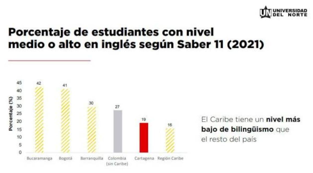 “Cartagena es una ciudad turística y es preocupante que mucha gente no sepa hablar inglés o no tenga un buen nivel. La ciudad está incluso por debajo del promedio nacional”, manifestó. Para esta área, el promedio nacional con nivel medio o alto de inglés se ubica en 27%.