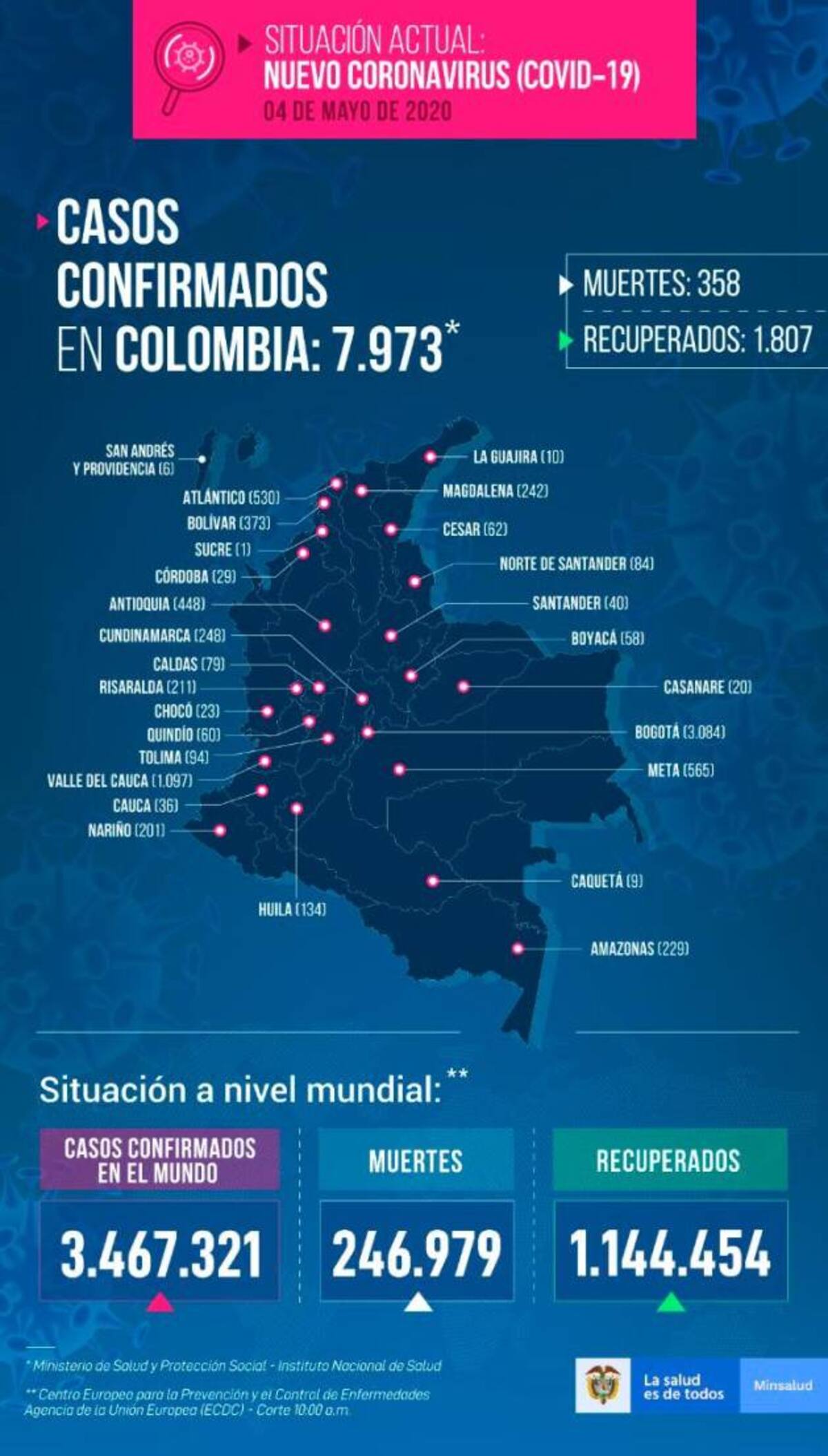 En la tarde de este lunes 4 de mayo el Ministerio de Salud reportó 305 nuevos casos de coronavirus en el país, ascendiendo a 7.973 los contagiados en Colombia.