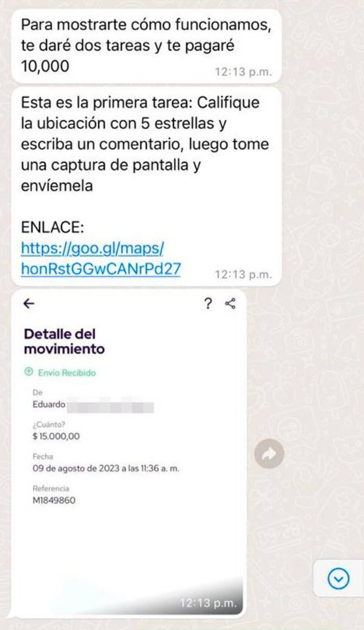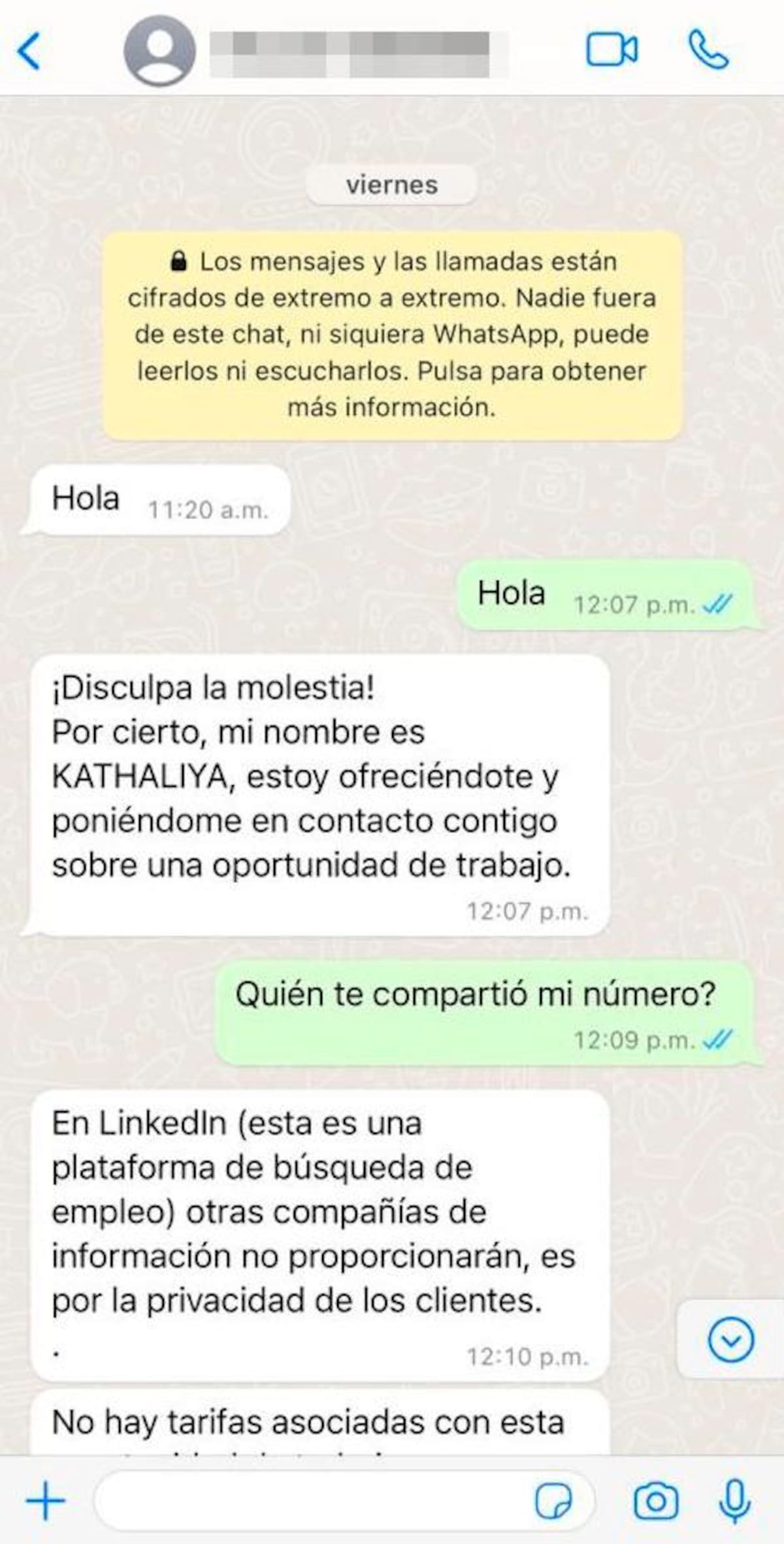Cuando Dina Luz Regino estaba en pleno estrés de oficina, le llegó un mensaje por WhatsApp de un número que no tenía agregado a su celular, un usuario que no tenía foto de perfil, y de manera insistente le pidió unos minutos para proponerle trabajo. Desde ahí, a Dina no le empezó a cuadrar lo que estaba pasando.