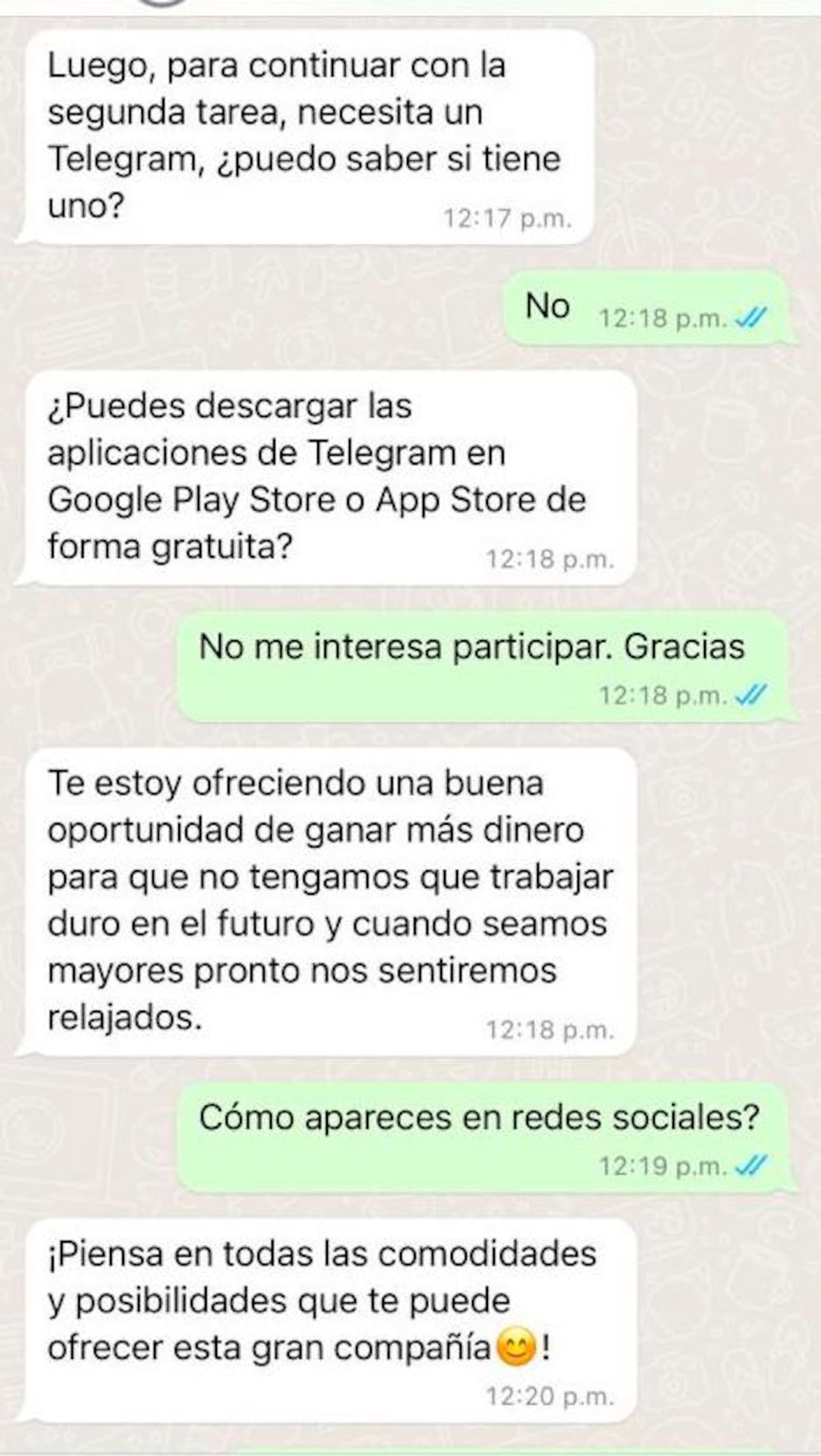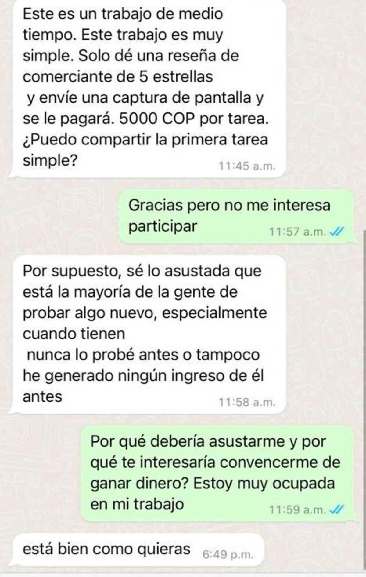 “Tengo que aclarar que no me dejé estafar, solo pongo en caso en conocimiento para que la gente sepa cómo operan, porque a varias amigas aquí en Cartagena les está llegando el mismo mensaje. Yo le pregunté que de dónde había sacado mi número, y me dijo que de Linkeding, lo cual vi que no era mentira, porque yo si tengo un perfil creado, donde coloco mi información laboral. Pero ya luego, la supuesta asesora se puso demasiado insistente”, contó Regino a El Universal.