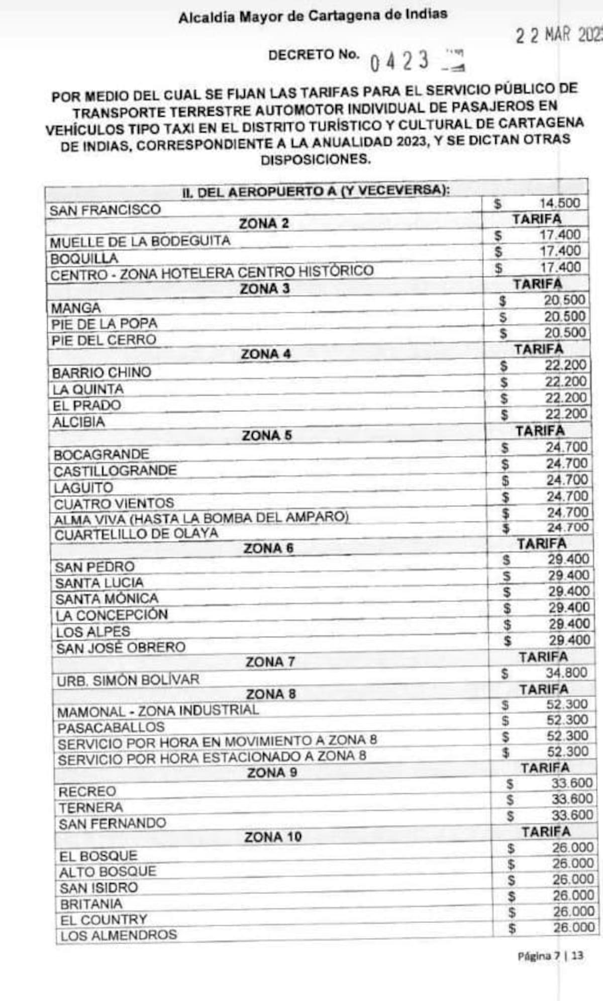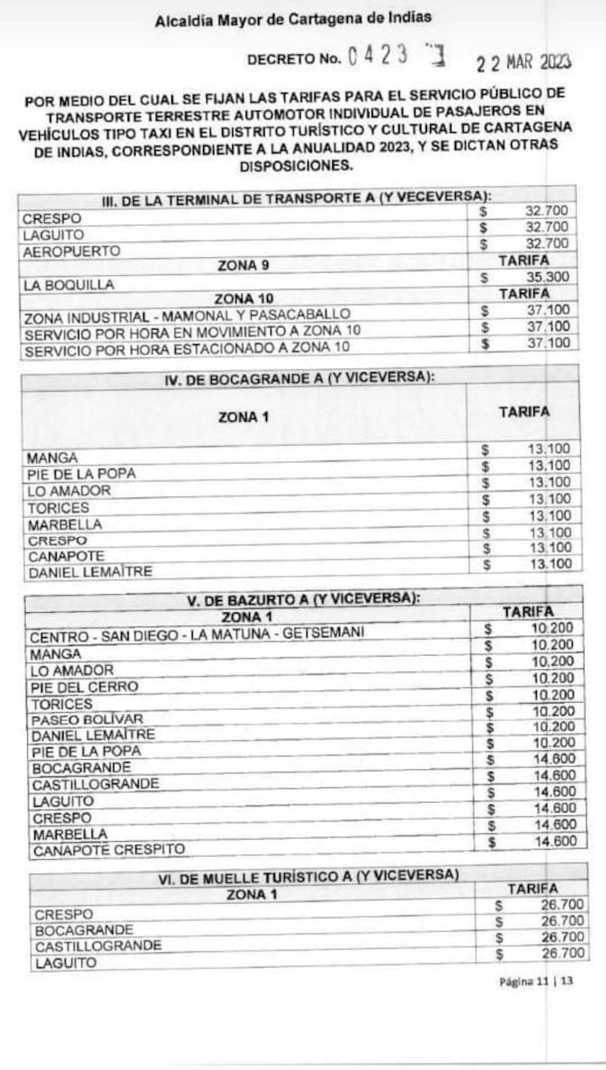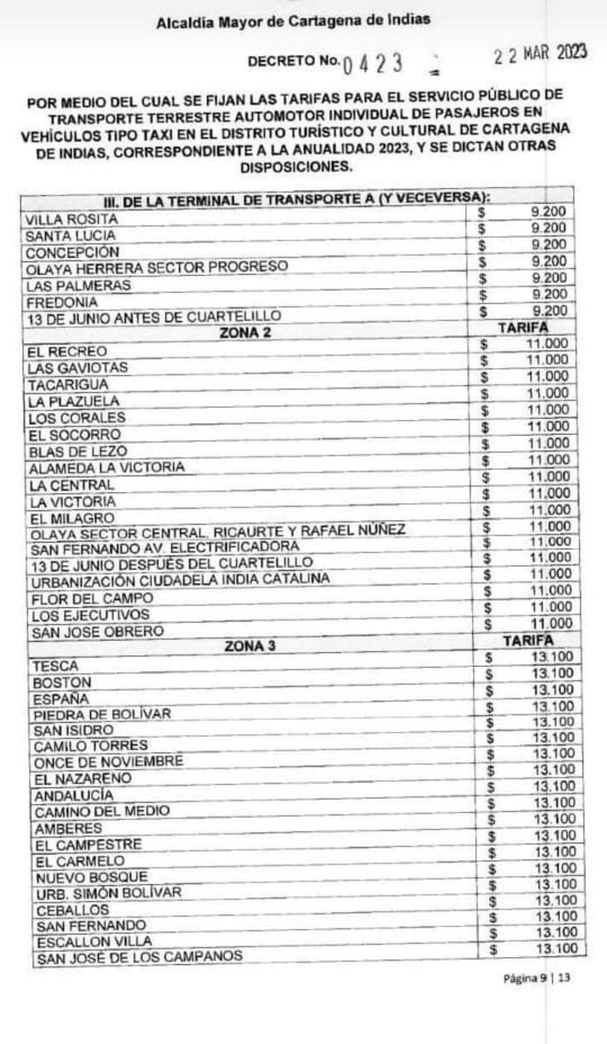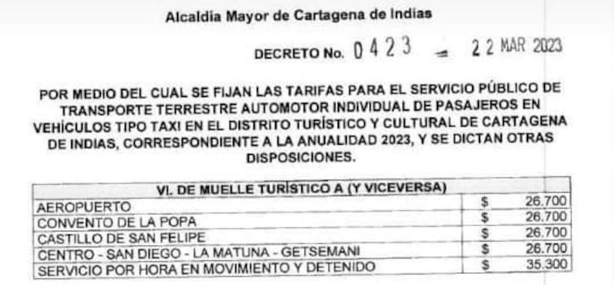 Mediante decreto 0423, la alcaldesa (e), Ana María González, fijó las tarifas para el transporte terrestre individual de pasajeros tipo taxi, para la vigencia 2023 en Cartagena.