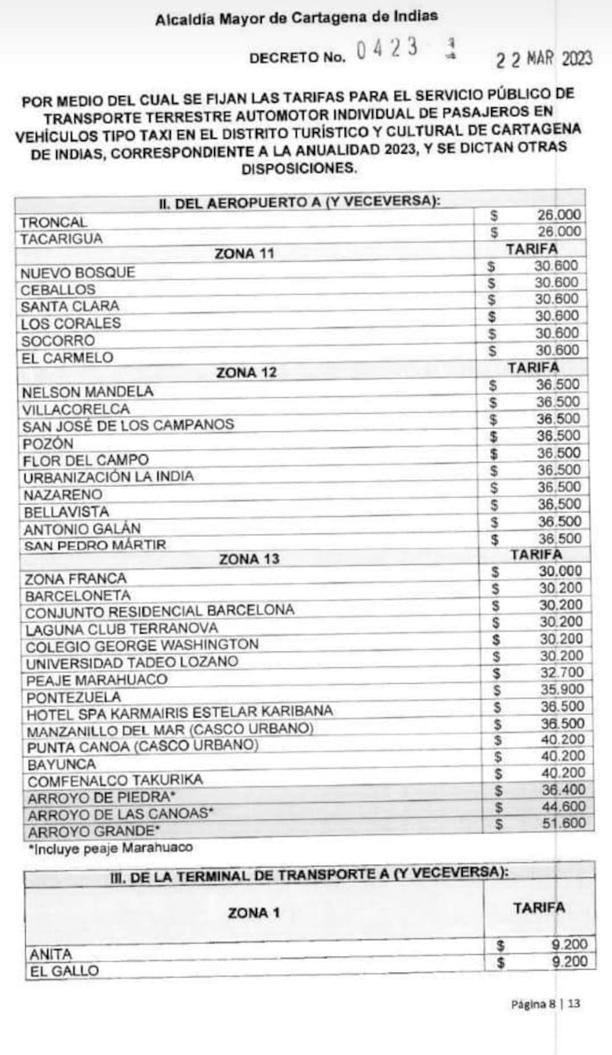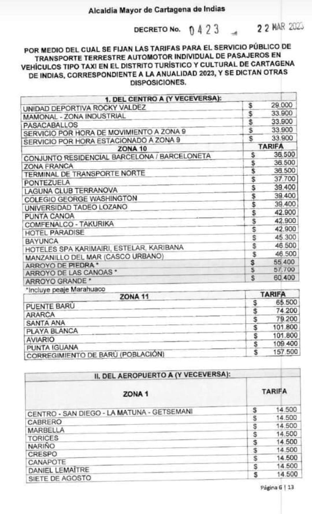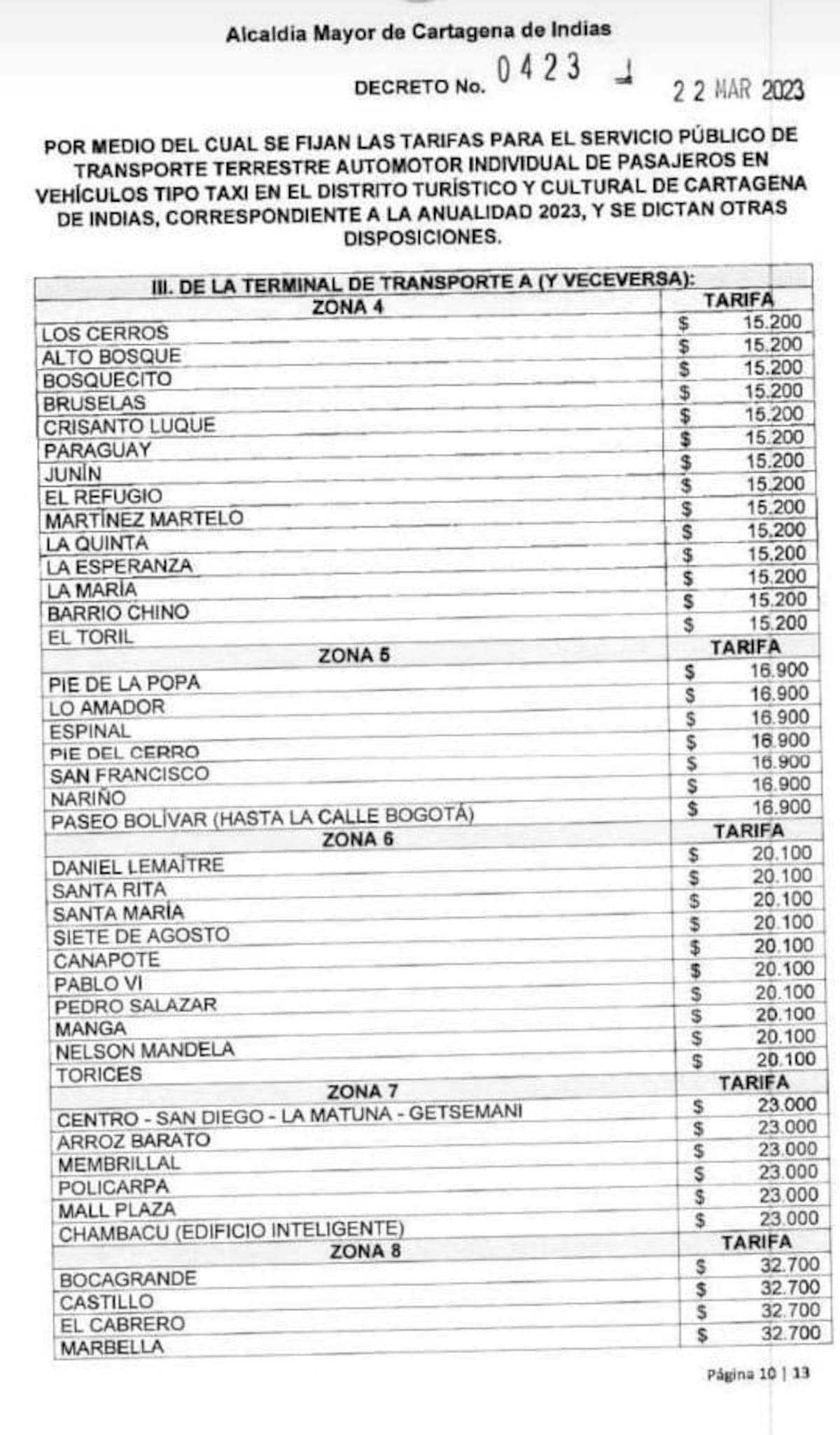 Mediante decreto 0423, la alcaldesa (e), Ana María González, fijó las tarifas para el transporte terrestre individual de pasajeros tipo taxi, para la vigencia 2023 en Cartagena.