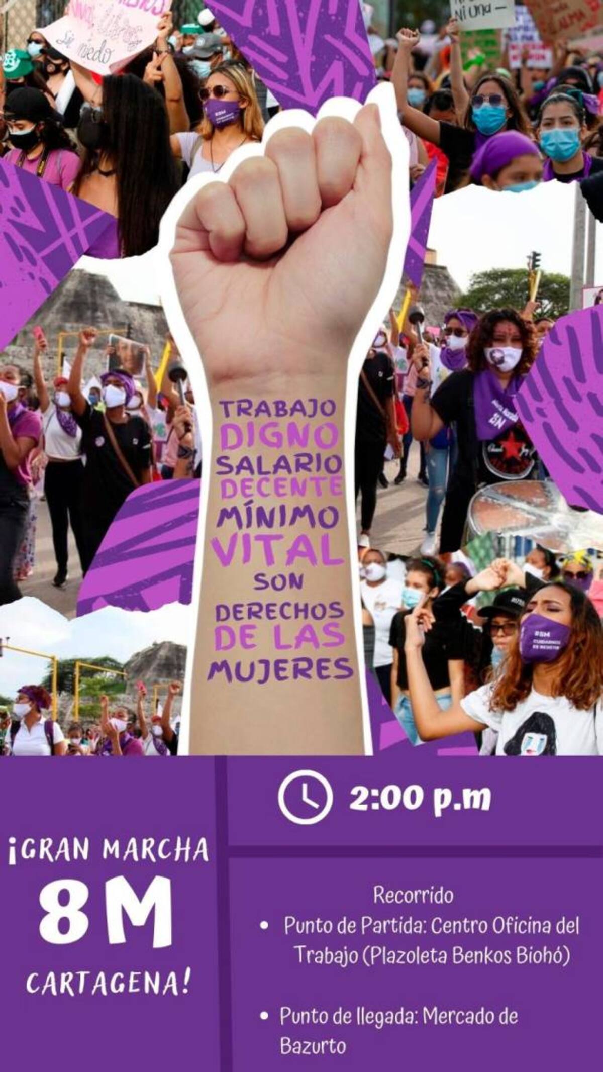 En Cartagena, la manifestación será liderada por mujeres, feministas y activistas independientes que se darán cita a las 2 de la tarde en el Centro, más exactamente en la Oficina del Trabajo, ubicada en la Plazoleta Benkos Biohó. La marcha partirá de allí y seguirá por la avenida Pedro de Heredia hasta llegar al mercado de Bazurto.
