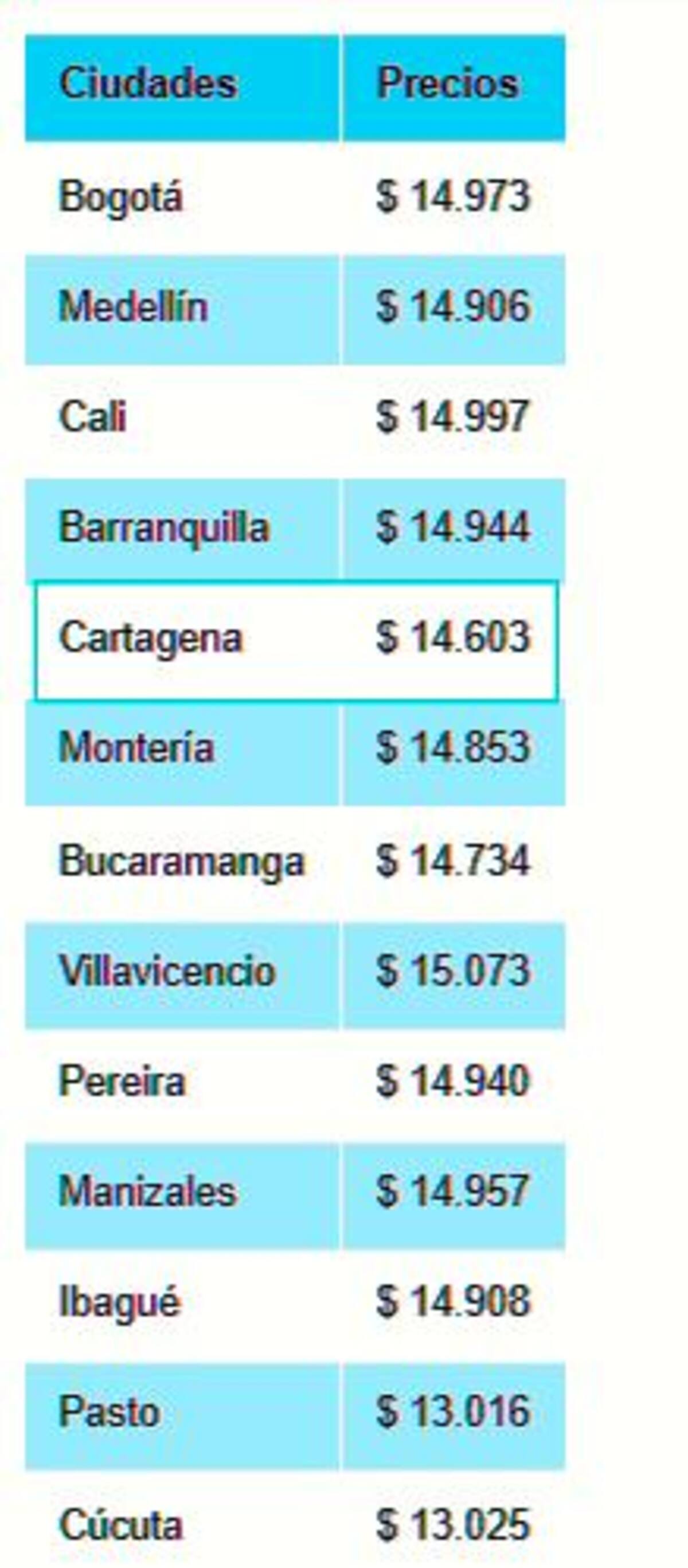 En la actualidad, el precio de combustible por galón se ubica en los 13.964 pesos en promedio. Si el aumento es de $400, el galón de gasolina en Cartagena quedaría en $14.403. Si el aumento es de $600, el galón de gasolina en Cartagena quedaría en $14.603, siendo uno de los más bajos en las ciudades mencionadas.