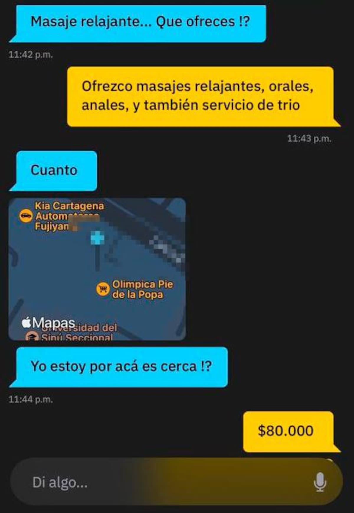 “Yo, inocente de todo, fui a buscar al muchacho a Manga, era la una de la madrugada. Estoy acostumbrado a que pase de todo cuando cojo ese horario un sábado, porque la gente está borracha y saliendo de fiestas. El muchacho se sentó en la silla de adelante y me dijo que si leí bien lo que me escribió. Cuando reviso el mensaje, decía que se dejaba comer por cincuenta mil. Yo de inmediato le dije que lo sentía mucho, pero que yo no había visto eso y que me respetara. Tuve que calmarme para evitar que me fuera a poner una mala calificación y después me fueran a bloquear la aplicación, ya que es mi fuente de trabajo”.