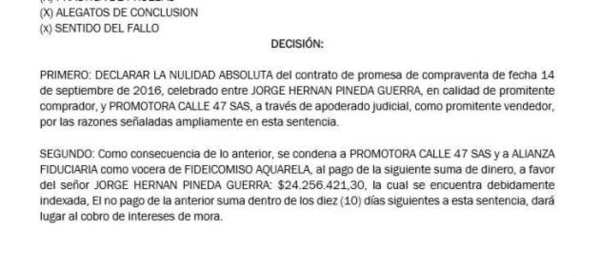 El Juzgado Séptimo Civil Municipal de Cartagena, en decisión de única instancia, declaró la nulidad absoluta del contrato de promesa de compraventa celebrado entre el ciudadano Jorge Pineda Guerra, en calidad de promitente comprador, y Promotora Calle 47 SAS, dueña del polémico edificio Aquarela.
