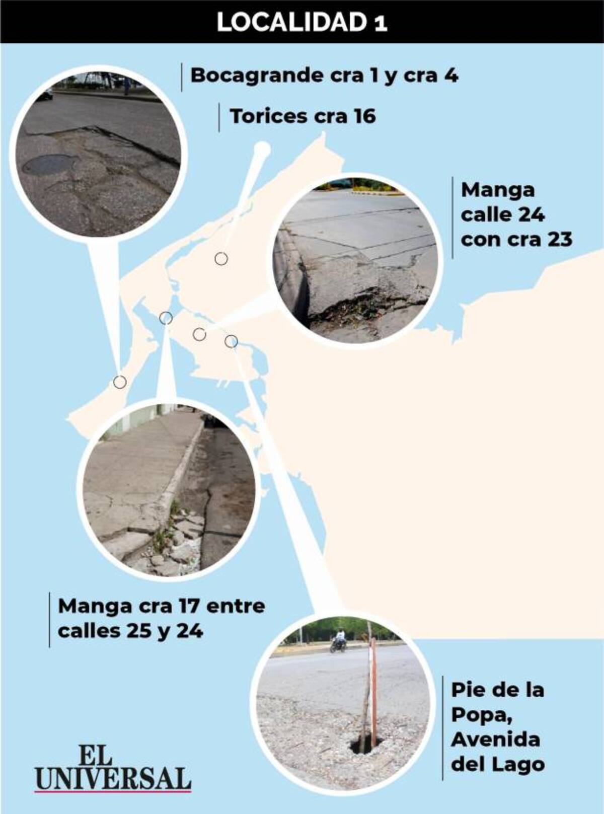 El contrato para la rehabilitación de la malla vial de Cartagena, en su primera fase, fue adjudicado el 4 de junio. El contrato por casi $8 mil millones entre A.G.E. Ingeniería SAS (zona 1), Consorcio RJ8 2 (zona 2), el Consorcio OA 2021 (zona 3), y el Distrito de Cartagena, indica que los presupuestos estarán distribuidos en tres partes, así: zona 1: $5.355.356.554, zona 2: $500.000.000 y zona 3: $2.141.409.546. ¿Cuáles son los puntos exactos en los que se realizarán las intervenciones?