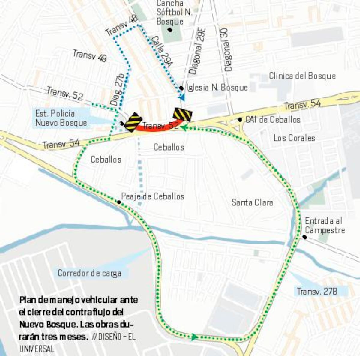 Por este motivo, los conductores que utilizaban esta vía para llegar a sus sitios de destino ahora deberán girar a la derecha antes de llegar a la Estación de Policía del Nuevo Bosque y tomar la diagonal 27b bis para conectar con la Transversal 54 y tomar la vía hacia el Corredor de Carga.