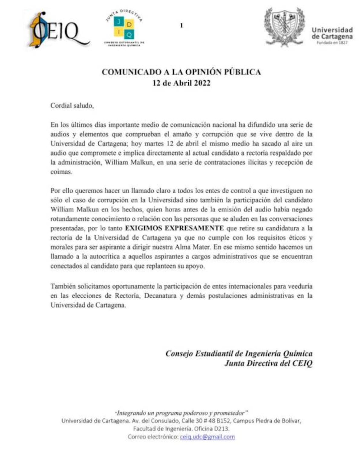 A raíz de estos hechos, el Consejo Estudiantil de Ingeniería Química de la UdeC le solicitó a William Malkun retirar su nombre como candidato al cargo de rector.