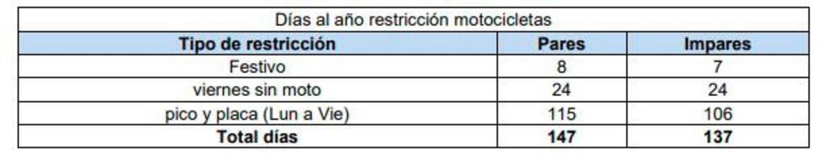 En un cálculo realizado por el gremio, se llegó a la conclusión de que son más de 100 días los que no pueden circular los motociclistas en Cartagena por cuenta de las restricciones de viernes sin moto, pico y placa y festivos. Específicamente para las motos cuyo último dígito es par, se trata de 147 días y para las impares 137 días.