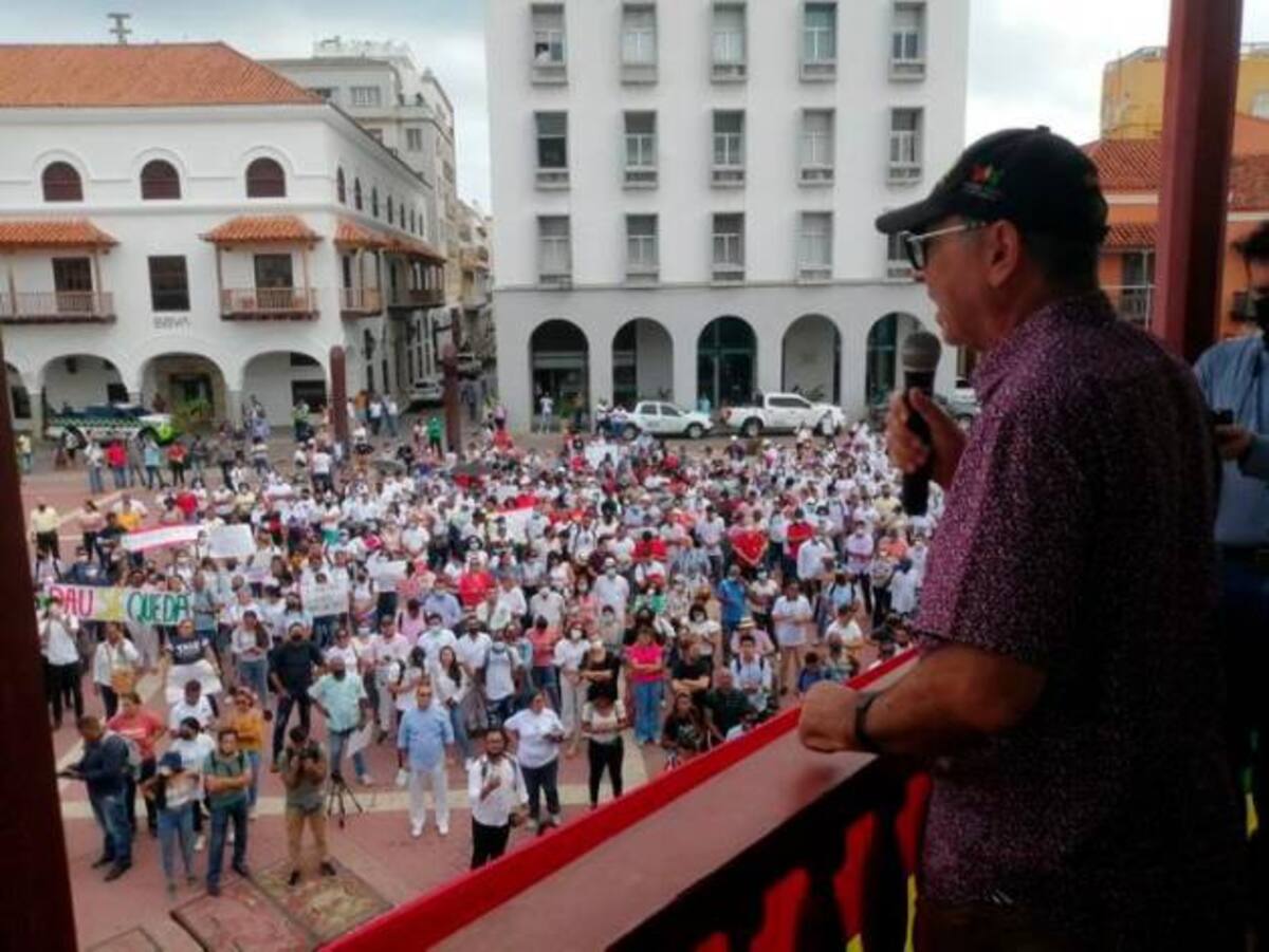 Alrededor de 300 personas se encuentran en la plaza de la Aduana, sede de la Alcaldía Mayor de Cartagena, para pedirle al presidente Iván Duque que no acepte la solicitud de suspensión de Dau por presuntas irregularidades en la compra de pruebas rápidas.