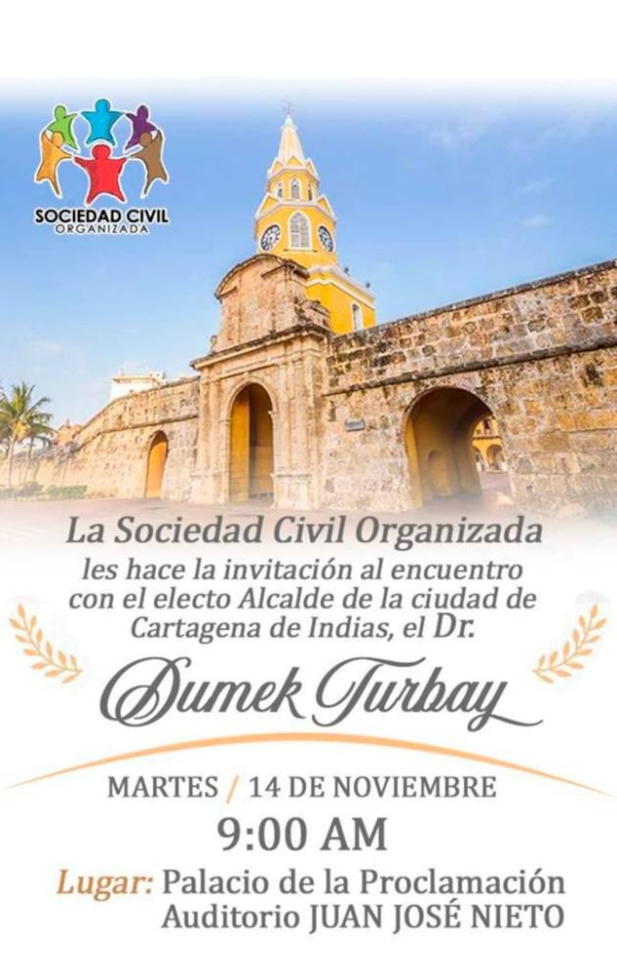 En el auditorio Juan José Nieto del Palacio de la Proclamación de Cartagena, la sociedad civil se reunirá con el alcalde electo del Corralito de Piedra, Dumek Turbay para exponerle al nuevo mandatario de los cartageneros las necesidades que tiene la ciudad. Lea: “Lo que se construyó alrededor del POT hay que rescatarlo”: Dumek Turbay