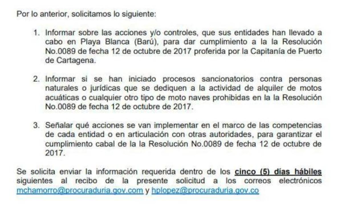 “Es preocupante que en Playa Blanca se utilicen y alquilen motos acuáticas a pesar de la expresa prohibición establecida por la Resolución 0089. (...) Los objetivos de las prohibiciones contenidas en la resolución son disminuir los impactos ambientales de estas actividades en los ecosistemas marinos de las áreas de importancia ambiental relacionadas en dicho acto, y la garantía de la seguridad de los ciudadanos para el ejercicio de las actividades marítimas de recreación y deportes náuticos, pero lamentablemente ha prevalecido el ánimo de lucro de unos particulares, que se protegen en unos supuestos derechos étnicos para explotar sin recato alguno los bienes ambientales que son de todos los cartageneros y colombianos”, expone la procuradora en el oficio.
