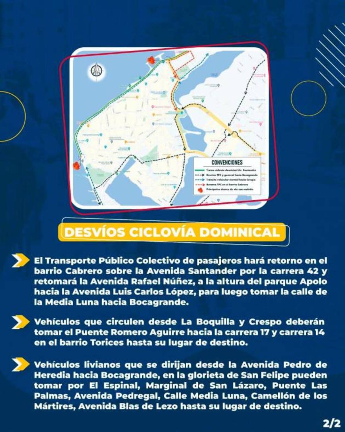 El Transporte Público Colectivo de pasajeros hará retorno en el barrio Cabrero sobre la Avenida Santander por la carrera 42 y retomará la Avenida Rafael Núñez, a la altura del parque Apolo hacia la Avenida Luis Carlos López, para luego tomar la calle de la Media Luna hacia Bocagrande. Lea: ¿Irá a la zona turística? Ojo, hay restricciones vehiculares por la temporada