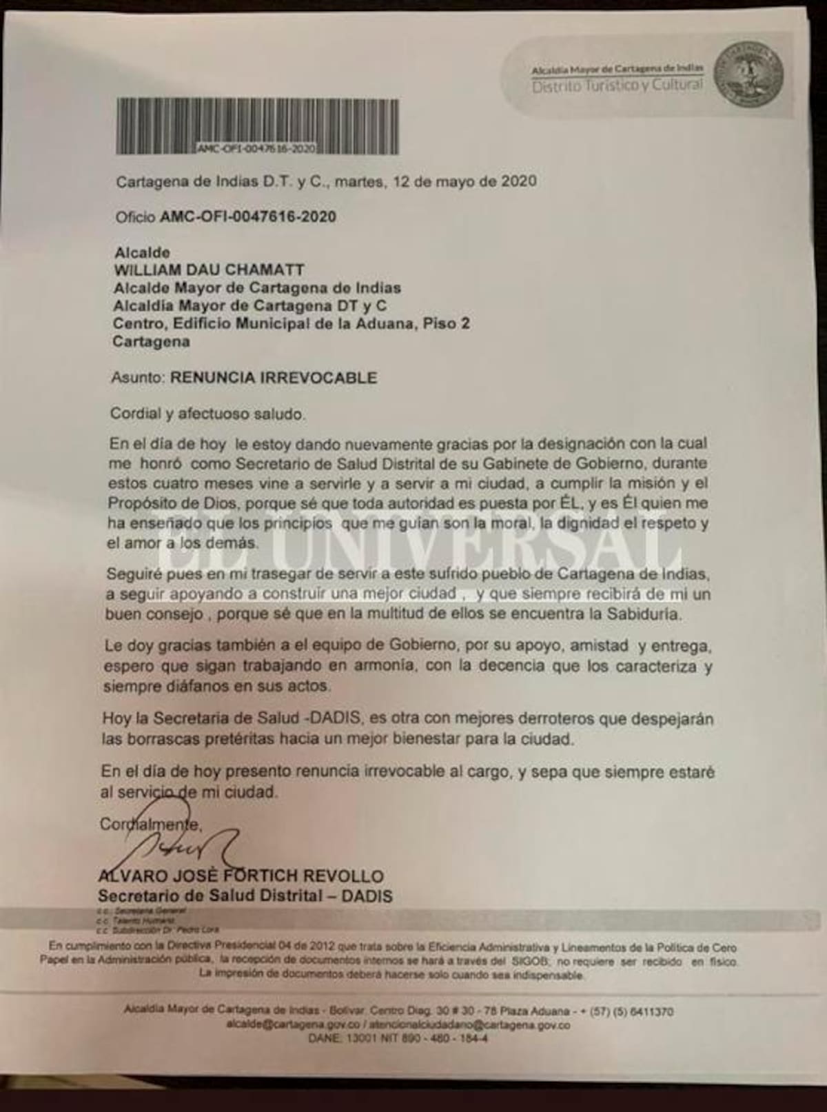 El Universal conoció la carta en la que el funcionario presentó al alcalde de Cartagena, William Dau, su renuncia irrevocable.