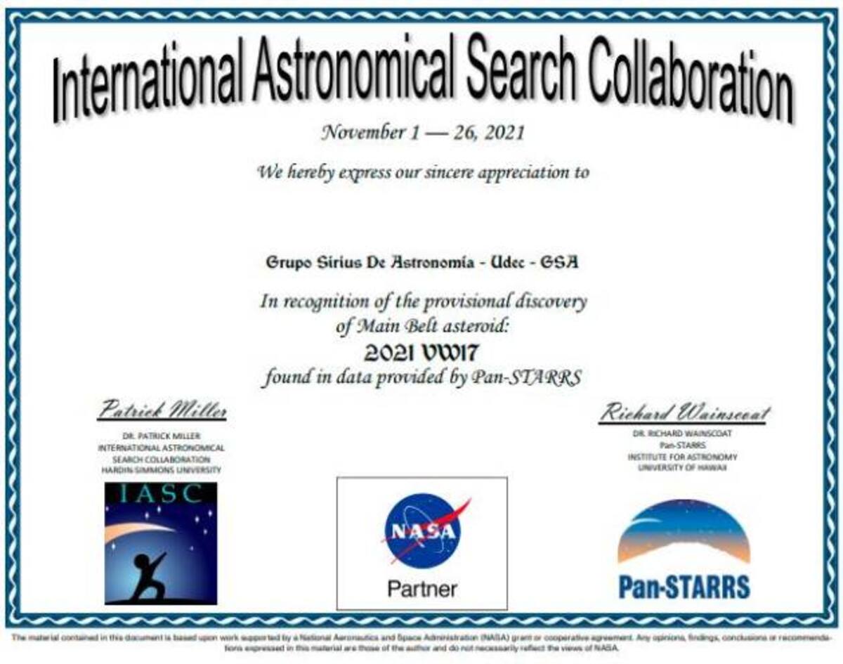 Sirius en medio de una campaña de la Colaboración Internacional de Búsqueda Astronómica (IASC por sus siglas en inglés), realizada entre el 3 y el 28 de noviembre de 2021, descubrió dos asteroides. Esas rocas fueron bautizadas: 2021UF103 y 2021VW17.