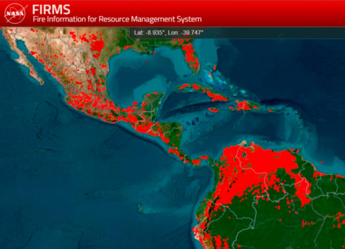 Esta alerta coincide con la información compartida por el Fire Information for Resources Management System (Sistema de Información sobre Incendios para la Gestión de Recursos o Firms, por su traducción al español) de la NASA, que publicó un mapa en el que se identifican los puntos de calor en todo el mundo en tiempo real.