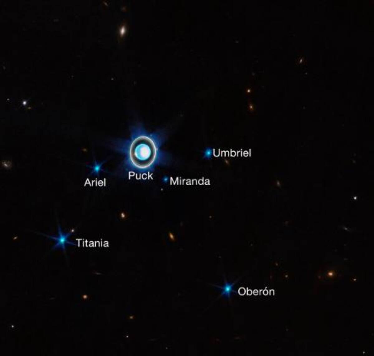 Las lunas más vistosas de Urano son Puck, Ariel, Miranda y Umbriel, Titania y Oberón.