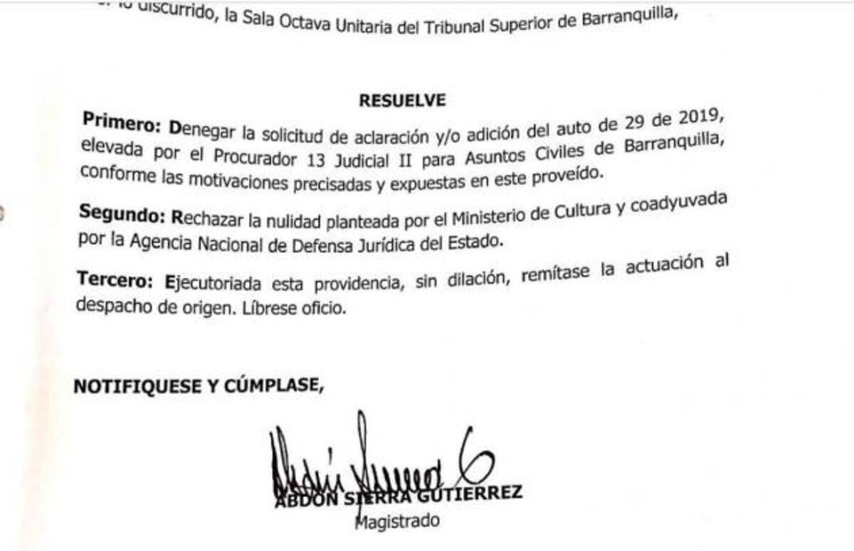 El Tribunal Superior de Barranquilla negó la solicitud de nulidad que el Gobierno Nacional, a través del Ministerio de Cultura y la Agencia Nacional de Defensa Jurídica del Estado, había interpuesto al embargo o secuestro de los tesoros contenidos en el galeón San José.