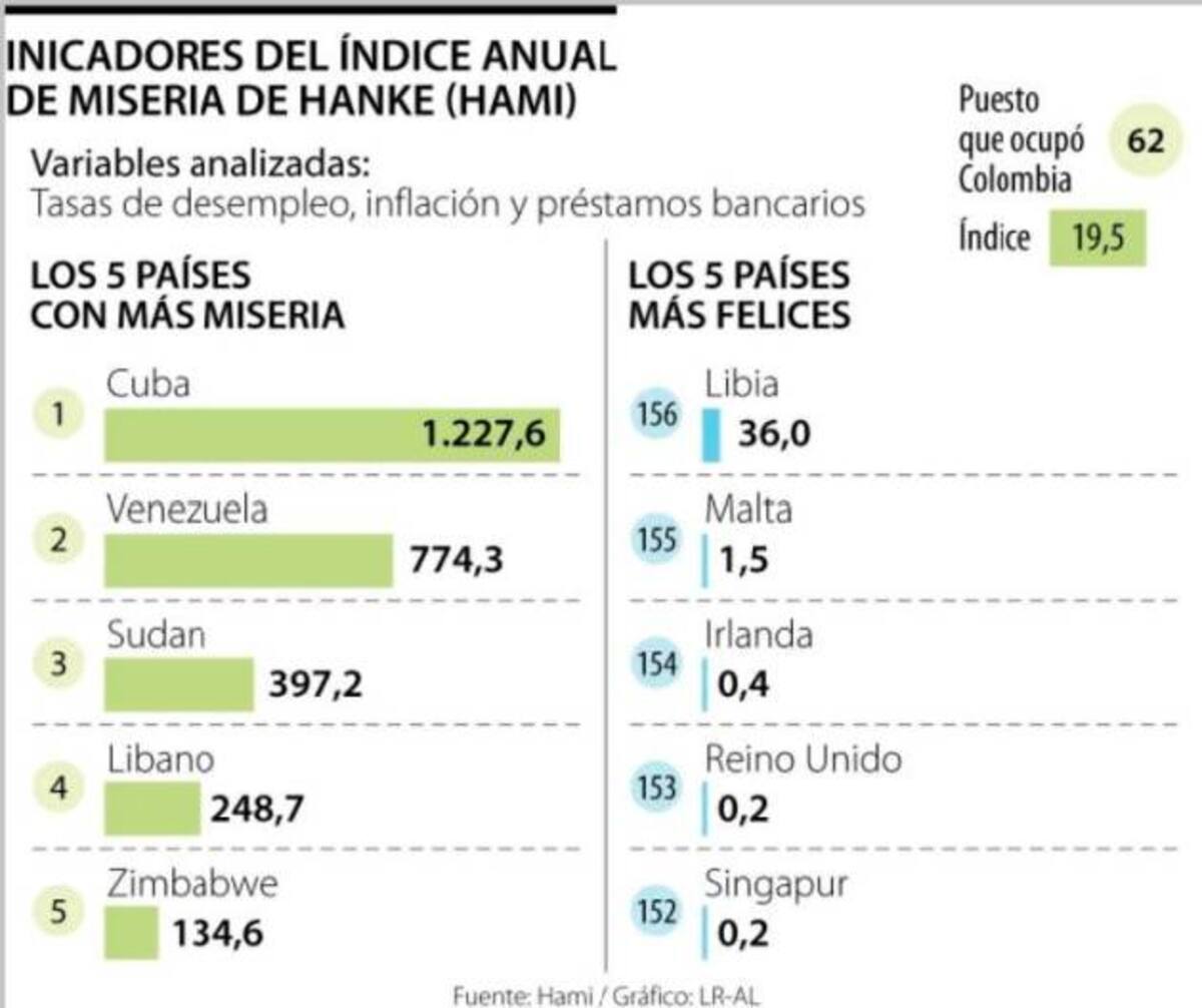 Salió el Índice Anual de Miseria Hanke (Hami) 2021 en el que cuatro países de América Latina aparecen como las naciones más “miserables”, entendiendo ese término como la suma de las tasas de desempleo, inflación y préstamos bancarios de fin de año menos el cambio porcentual anual en el PIB real per cápita. En ese sentido, el índice llama “feliz” o “bueno”, cuando hay un crecimiento real del PIB per cápita.