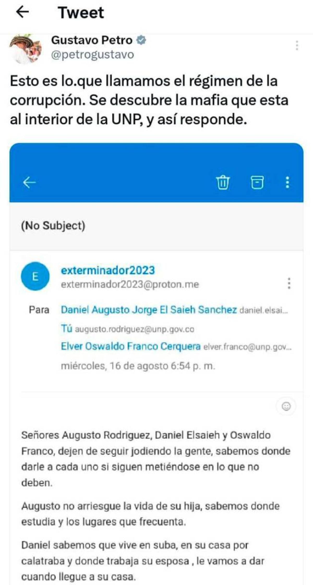 La UNP dio a conocer un correo electrónico enviado tanto a Rodríguez como a Elver Oswaldo Franco, coordinador del Control Interno Disciplinario. En este un usuario anónimo les ordena que “dejen de seguir jodiendo la gente”. Le puede interesar: ONU denuncia amenazas de muerte contra miembros de la UNP