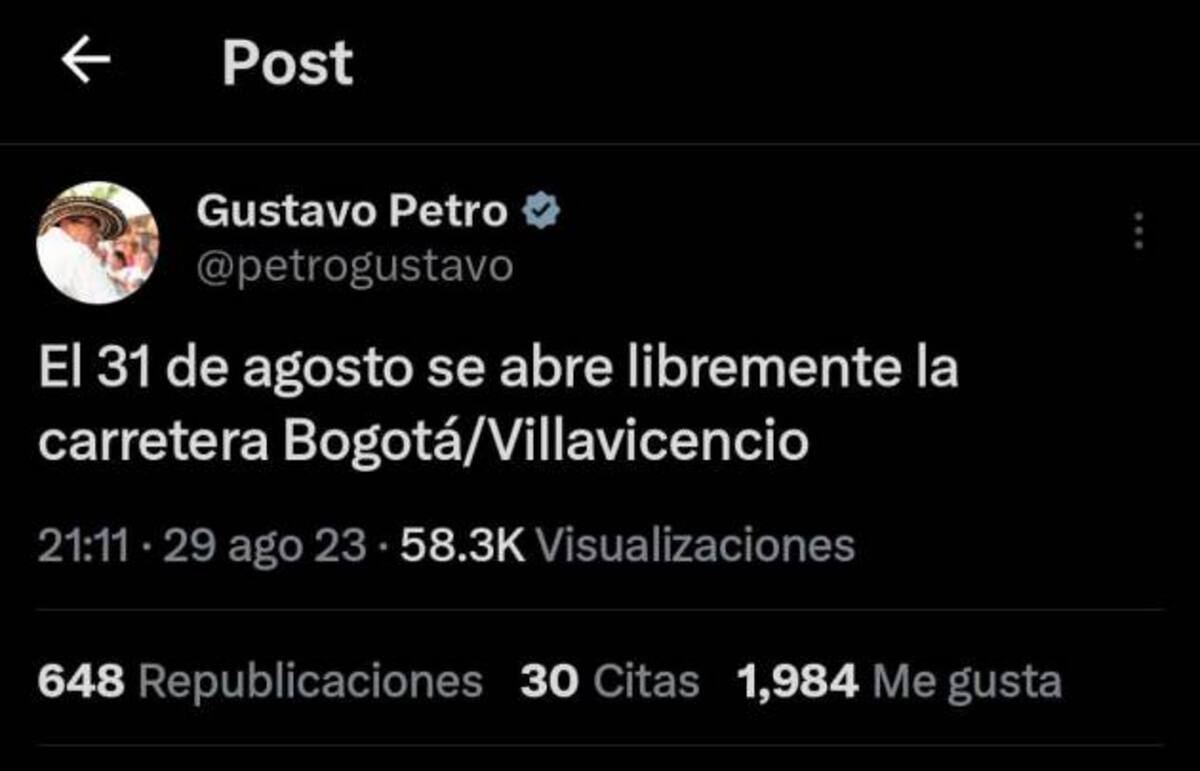 El presidente Gustavo Petro anunció que la vía Bogotá-Villavicencio, conocida como la vía al Llano, será reabierta el próximo jueves 31 de agosto, después de varios días de cierres viales debido a las fuertes lluvias y manifestaciones en la región.
