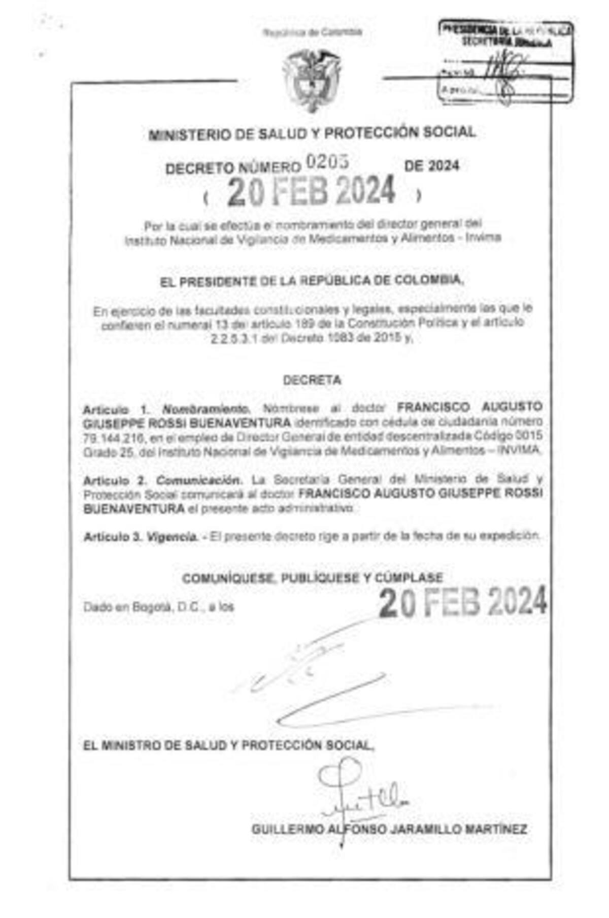 Es un hecho. Tras casi año y medio de interinidad y vacilación, formalmente fue nombrado Francisco Rossi Buenaventura como director del Instituto Nacional de Vigilancia de Medicamentos y Alimentos (Invima).