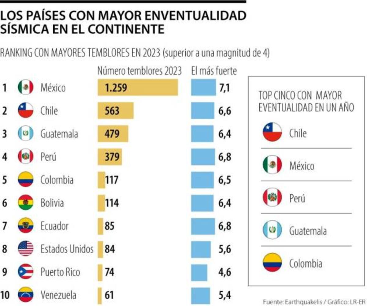 En otro apartado, según el ranking regional, México, Chile y Perú son los que reportan mayores eventos sísmicos en un año, le sigue Guatemala y luego Colombia.