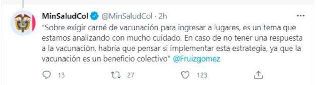 “Sobre exigir carné de vacunación para ingresar a lugares, es un tema que estamos analizando con mucho cuidado. En caso de no tener una respuesta a la vacunación, habría que pensar si implementar esta estrategia, ya que la vacunación es un beneficio colectivo”, señaló el funcionario.